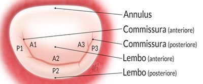 Lembi valvolari mitralici con i 3 scallops (A1, P1 - A2, P2 - A3, P3), delle due commissure e della continuità mitro-aortica.