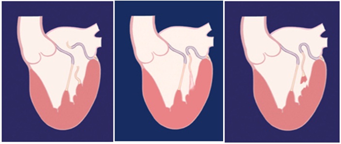 Insufficienza mitralica di tipo II, dovuta a rottura o stiramento di una corda tendinea (a sinistra e al centro), o a rottura di un muscolo papillare (a destra).