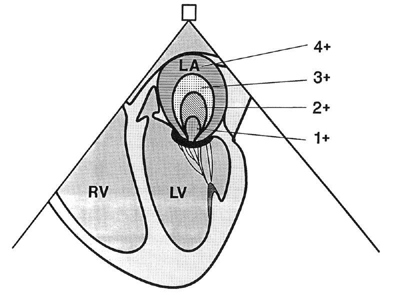 Il diagramma mostra la valutazione della severità dell’insufficienza mitralica usando l’approccio transesofageo con vista asse-lungo. La gravità dell’insufficienza mitralica (1-4+) viene stabilita in base alla lunghezza e alla larghezza del flusso di jet nell’atrio sinistro. LA, atrio sinistro.; RV, ventricolo destro; LV, ventricolo sinistro.